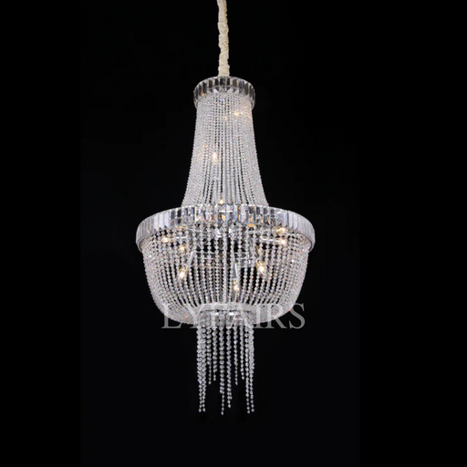 View full detailsThis empire chandelier features a pendant design with crystal and a polished silver finish frame. The whole light has a clean line sense, fanciful ...