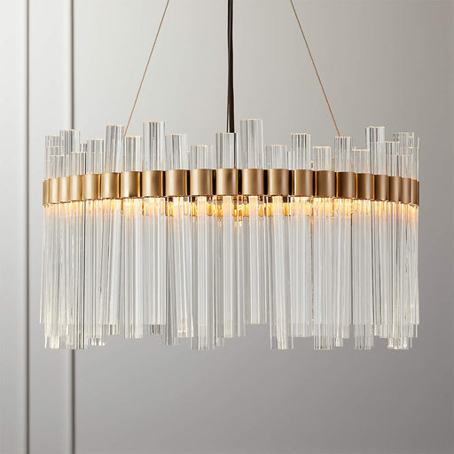 View full detailsThis chandelier features a modern rectangular silhouette created by clear glass rods suspended from steel holders. Its numerous glass rods provide ...