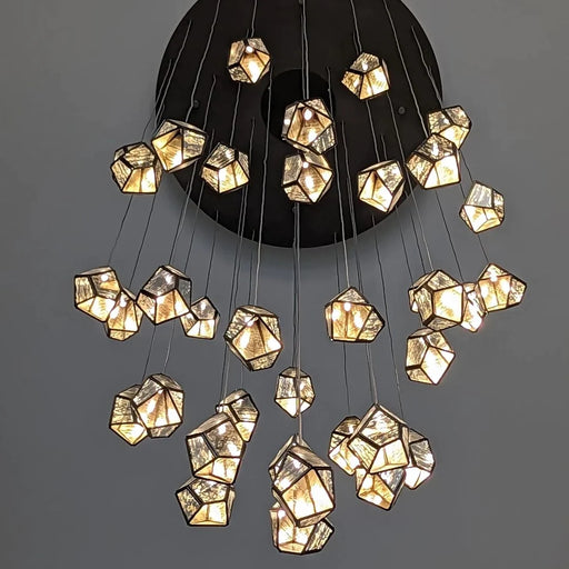 View full detailsMaximize your space with this irregular cutting diamond multi-drop chandelier. Its faceted mirror shades, joined with brass seams, create a unique ...