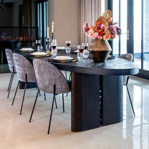 View full detailsThe Blackbone Dining Table is a timeless piece of furniture. Its oval black oak tabletop is designed in a herringbone pattern, set atop a matrix br...