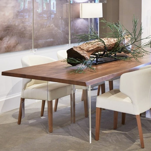 View full detailsThis Rustic Dining Table features a live edge top in a Barn finish, elegantly supported by a V-shaped acrylic pedestal base. This modern take on ru...