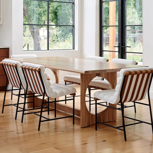 View full detailsModernist dining table available exclusively at lyfairs that offers your space graphic-cool appeal. Featuring a slatted tabletop with dual plank ba...