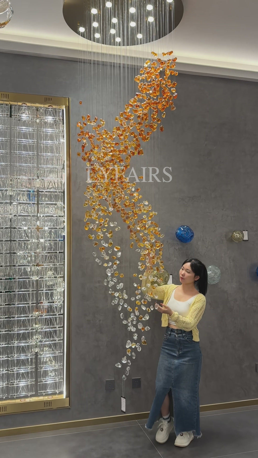 Modern Cascading Spiral Orange Glazed Glass Stone Chandelier for High Ceiling