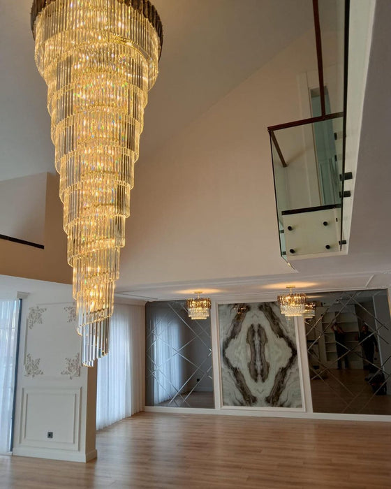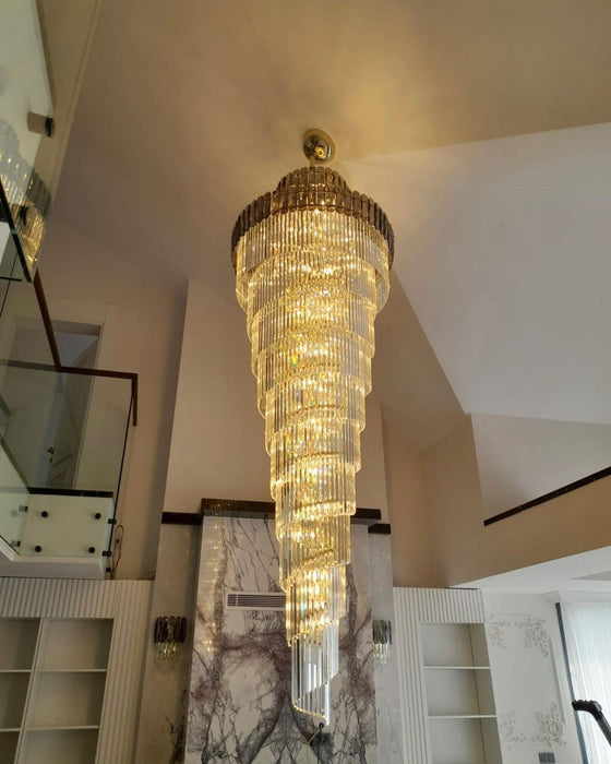 Lámpara de araña de escalera en espiral para vestíbulo Extra grande de lujo, accesorio de iluminación de techo largo de cristal para sala de estar y entrada