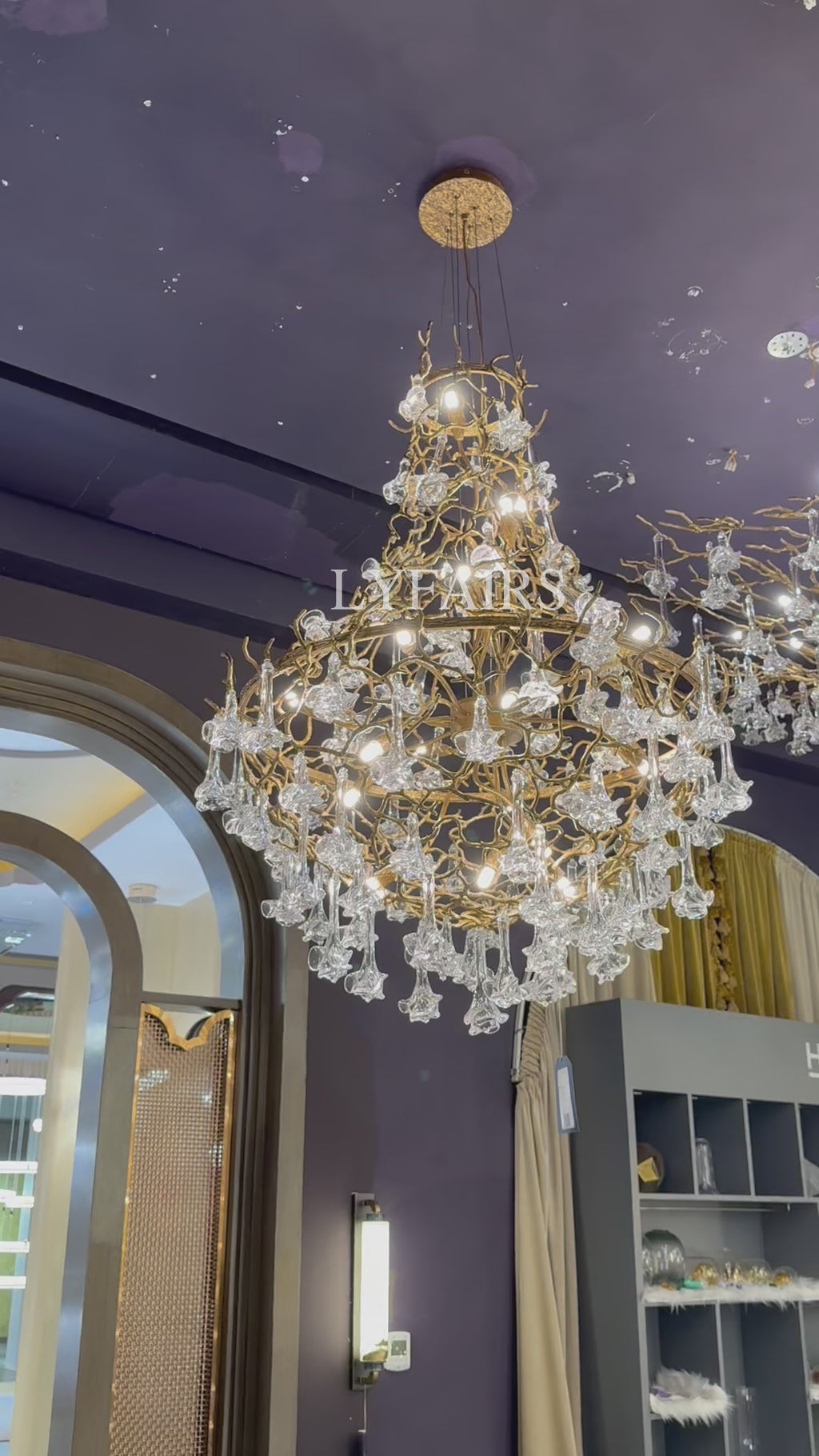 Nature-inspired Brass Tree Chandelier with Glazed Glass Flowers