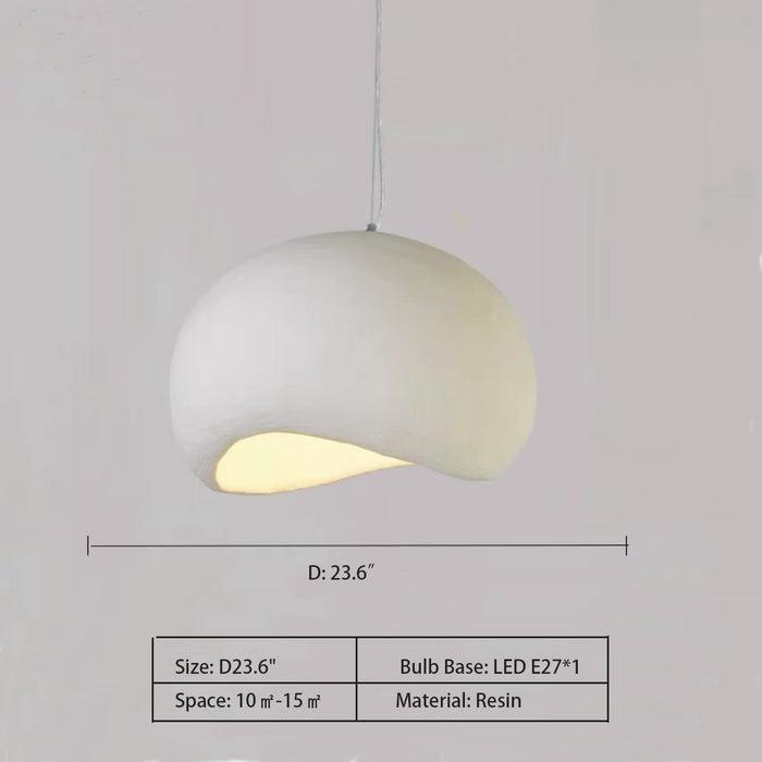 Questo lampadario unico pende dal soffitto come un fungo atomico fatto di resina. Il design cavo, in cui è nascosta un'unica lampadina, fornisce una ricca illuminazione dello spazio. Diverse dimensioni, pezzi singoli o gruppi liberamente combinabili per soddisfare le diverse esigenze funzionali. Perfetto per l'installazione su tavoli da pranzo, isole cucina, water bar o aree commerciali, inclusi bar, caffetterie, ristoranti, ecc.