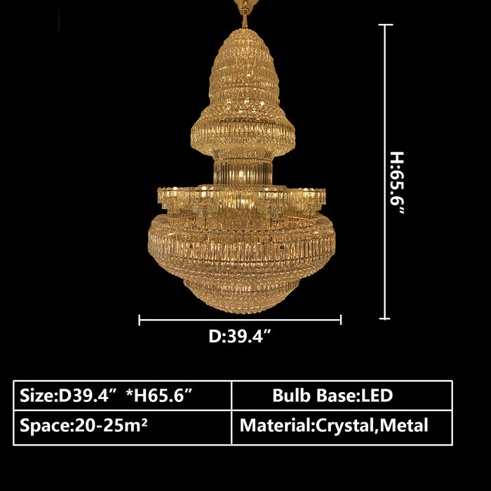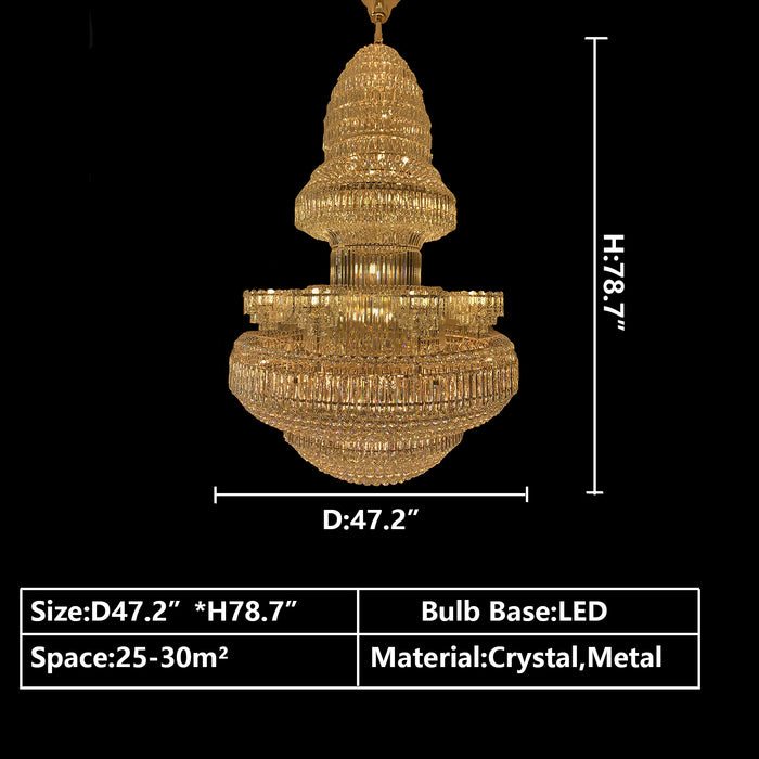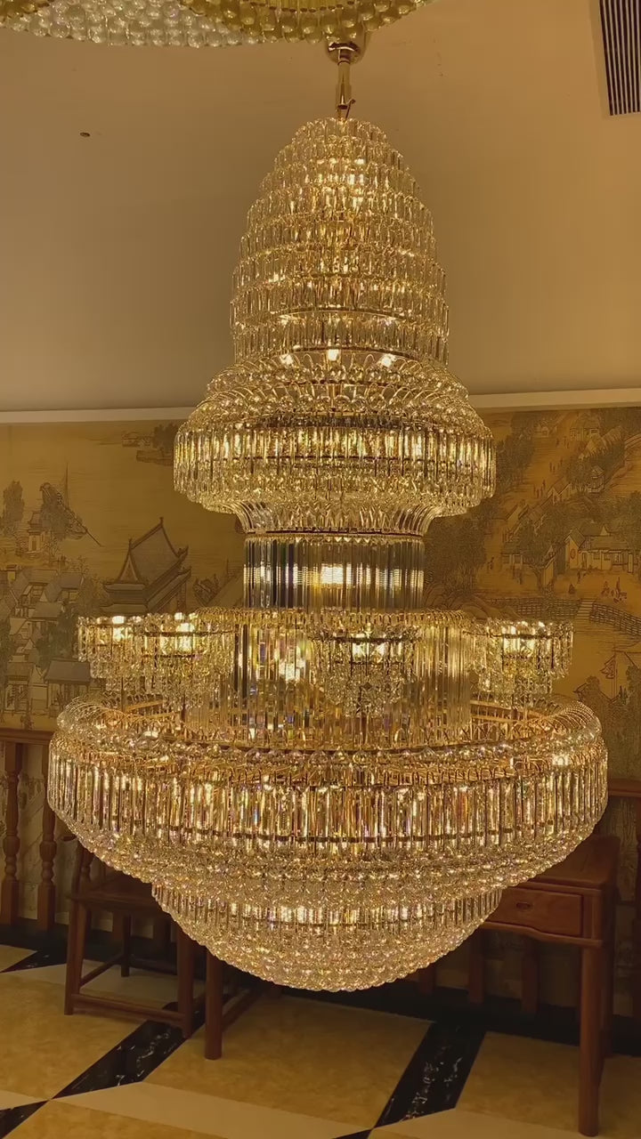 This golden oversized crystal chandelier is made of high quality k9 crystal chandelier with hardware, the round empire shape gives this chandelier a unique visual experience, the combination of classical and modern, the collision of elegance and majesty, all make this lamp dazzling and advanced, this lamp whether decorated in your living room, foyer,staircase,hallway  or decorated in the cafe, restaurant, can be fascinating!