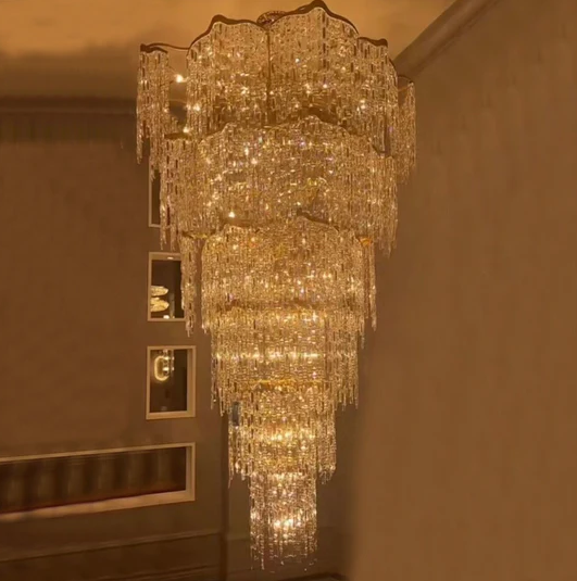 This golden luxury crystal chandelier is made of high-quality crystals and the metal part is made into a wave shape, elegant with luxury, this chandelier can be decorated in villas, duplexes, loft in the foyer, stairs, and living room. Whether in a villa, duplex, loft, foyer, staircase, or living room in a cafe, restaurant, or hotel lobby, it creates a high-class luxury atmosphere. Enhances the taste of decoration.